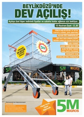 - Dünyanın en büyük market arabasını oluşturup – sergileyerek Guinness Dünya Rekorları kitabına girmeye hazırlanan Migros’un Genel Müdürü Özgür Tort, “Açılış için özel olarak dev bir alışveriş arabası inşa ettirdik. Dünyanın en büyük alışveriş arabası ile dünya rekorunu kırmak bizim perakendede ve alışverişte kıracağımız rekorların sembolü olsun istedik” demiş. Çok iddialı bir açıklama öyle değil mi? Açılışta orada olmakta fayda var… Bence kesin “büyük ve gerçek” indirimler bizi bekliyor 😉
