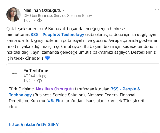 Türk Girişimci Neslihan Özbuğutu tarafından kurulan BSS (Business Service Solution), Almanya Federal Finansal Denetleme Kurumu (BaFin) tarafından lisans alan ilk ve tek Türk şirketi oldu. Bu, hem sektör hem de ülkemiz için büyük bir gurur kaynağı.