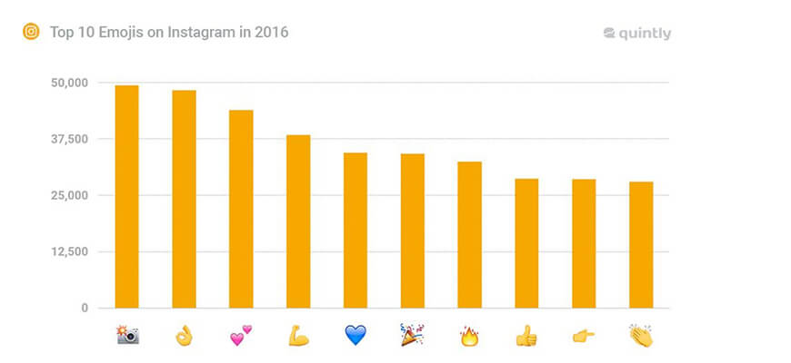 Analiz edilen Instagram profilleri arasında, emoji kullanımı güçlü bir şekilde artışa geçen bir trend. Daha önce belirttiğim gibi, aynı çalışma, 2016’da kamera ikonunun en çok kullanılan emoji olduğunu göstermişti. Sonuç olarak, emojilerin daha fazla etkileşim sağladığını kanıtlayabiliyoruz. Instagram ve emojiler üzerine olan bu çalışmayı özetleyecek olursak, şunu söyleyebilirim ki, emojiler etkileşim sayılarını arttırmak için ciddi anlamda faydalı. İşletmeler için ise, bu tür hesaplar da duyguları ifade etmek ve biraz daha kişisel bir dokunuş yakalamak için, aşırıya kaçmamaya dikkat ederek emoji kullanımını denemeliler.