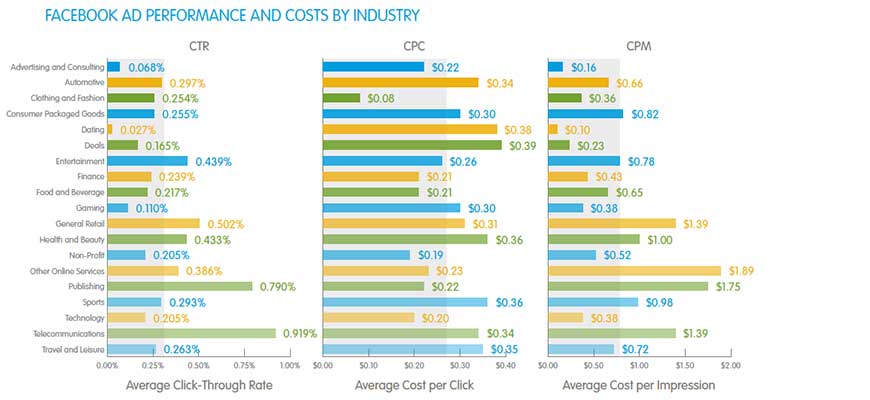 Facebook reklam maliyetini ortaya çıkarmaya çalışırken birkaç faktörü işin içine katmanız gerekir. Ama öncesinde Facebook reklamlarının nasıl çalıştığına birlikte bakalım. Facebook reklamlarının performansı konusunda, iş kollarına göre düzenlenmiş aşağıdaki çizelge size fikir verecektir.