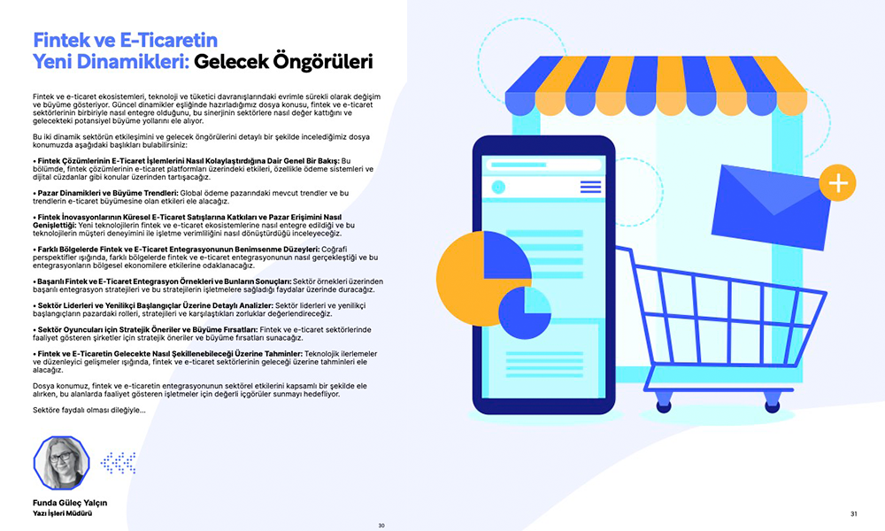 Sektörel gelişmeleri ve süreci yansıtma heyecanıyla yine emek ve bilgi dolu bir sayı hazırladık. Bu sayıda sizler için “Fintek ve E-Ticaretin Yeni Dinamikleri: Gelecek Öngörüleri” dosya konusunu kaleme aldım.