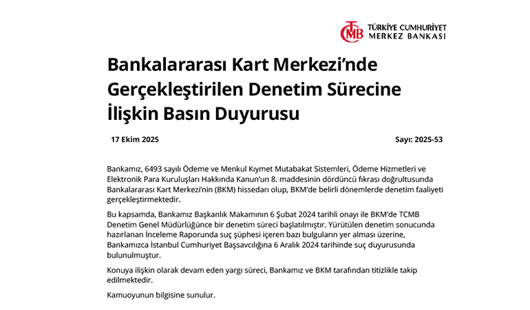 TCMB, Bankalararası Kart Merkezi’nde yürütülen denetimde suç şüphesi içeren bulgular tespit edilmesi üzerine İstanbul Cumhuriyet Başsavcılığına suç duyurusunda bulundu. Süreç yargı ve denetim mercilerince yakından izleniyor.