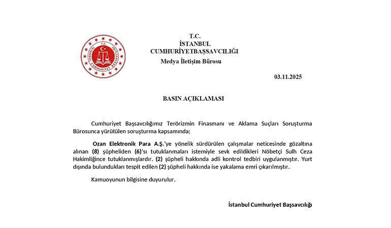 İstanbul Cumhuriyet Başsavcılığı tarafından yürütülen Ozan Elektronik Para A.Ş. soruşturmasında yeni bir gelişme yaşandı. Yasa dışı bahis gelirlerinin finansal sisteme aktarılması ve POS tefeciliği iddiaları kapsamında 11 kişi gözaltına alındı, toplam 72 milyon TL değerinde mal varlığına el konuldu.