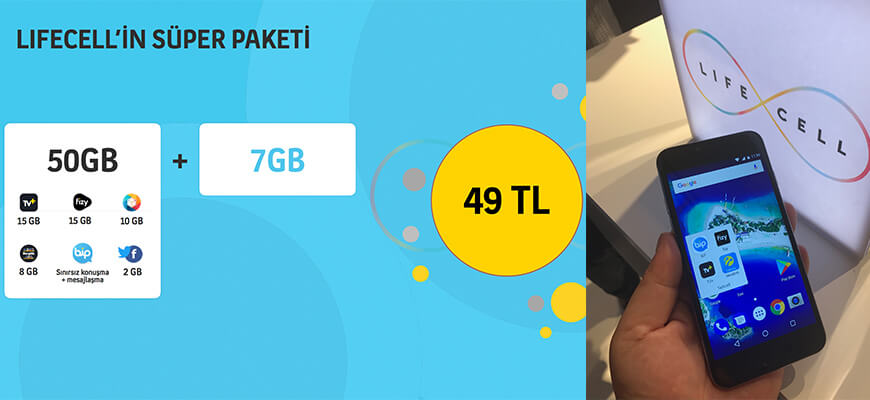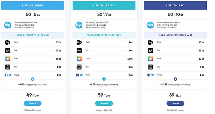 Super, Extra ve Pro olmak üzere üç ayrı paket ile gelen Lifecell tarifelerinde yer alan uygulamalarda geçerli 50GB yer alacak. Lifecell’de Super tarifesini seçecek abonelere toplam 55GB’lik internet paketi 49 TL’ye satılacak. Extra paketini tercih eden aboneler ise toplamda 57 GB’lık internet paketine 59 TL’ye sahip olacak. Toplamda 60 GB’lık Lifecell Pro tarifesi ise kullanıcılara 69 TL’den sunulacak. Ayrıca ilk 2 ay içerisinde Lifecell’li olanlara tarifelerindeki internet paketlerine ek olarak 2GB internet de 12 boyunca hediye edilecek. Tüm paketlerde BiP’ten BiP’e sınırsız konuşma ve mesajlaşma ile BiP’ten her yöne 1000 dakika arama yer alacak. Yine her pakette Twitter ve Facebook’a özel 2GB’lik internet bulunacak.