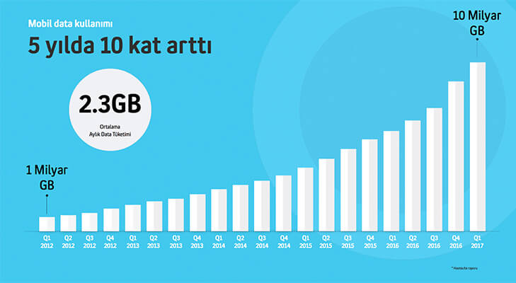Mobil data kullanımının 5 yılda 10 kat arttığına değinen Bütün, ortalama aylık data tüketiminin 2.3 GB olduğunu ekledi ve 2012 – 2017 yılları arası değişen mobil data kullanımına ait grafiği bizlerle paylaştı.
