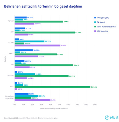 LATAM bölgesinde, SDK Spoofing %51.16 ile hala en çok kullanılan yöntem. Bu yüzden, pazarlamacıların bu sahtecilik yöntemiyle mücadele ederken ücretsiz SDK İmzası gibi çözümleri uygulamaları çok önemli. SDK İmzasının daha yaygın kullanıldığı pazarlarda, sahtecilerin işlerini daha zor ve daha az kazançlı hale getiren alternatif yöntemlere başvurmak zorunda kaldıklarını görüyoruz. Böylece uygulamaların reklam bütçelerinin çalınma olasılığı daha düşük oluyor. Ancak bu, diğer bölgelerde SDK Spoofing riskinin daha az olduğu anlamına gelmiyor. Kendilerini korumak için SDK imzası kullanmayan şirketlerin içinde bulundukları riskler, pazardan bağımsız olarak aynı veya daha yüksek. Adjust verileri aynı zamanda SDK Spoofing’in en yaygın görüldüğü sektörlerin %59.7 ile Yeme & İçme ve %34.9 ile İş uygulamaları olduğunu gösteriyor.