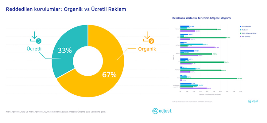 Araştırma, sahtecilerin çaldıkları ücretli kurulumları gizlemek için ücretli reklamlardan gelen kurulumları taklit etmekle kalmayıp, aynı zamanda herhangi bir pazarlama aktivitesine bağlanamayan organik trafiği de taklit ettiklerini ortaya çıkardı. Reddedilen 200 milyon kurulumun üçte ikisi organik ve sadece üçte biri ücretli reklamlardan gelen kurulumlardı. Mobil pazarlamacılar teknik olarak para kaybetmese de, bu sahte organik kurulumlar pazarlamacıların karar almakta kullandıkları verilerin ve geri bildirimin bütünlüğünü bozuyorlar. Pazarlamacılar, sahte aktivitenin yaygın olduğu ve organik veriler de dahil pazarlama verilerinin kirli olduğu durumlarda, kararlarını verilerin ışığında alamıyorlar ve bir “kör uçuş” riski taşıyorlar. Özellikle oyun sektörüne bakıldığında verilerimiz, küresel sahtecilik oranlarının Ağustos 2019 ve Ağustos 2020 arasında %172.95 arttığını gösteriyor. EMEA bölgesinde bu artış %181.20, ABD’de %310.29 ve APAC bölgesinde %214.86.