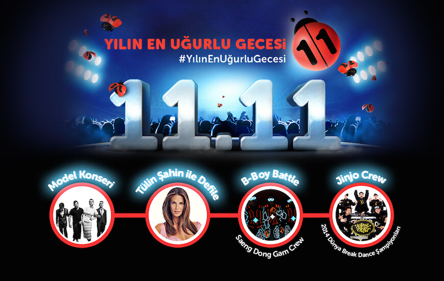Alışverişin Uğurlu Adresi n11.com, 11 Kasım 2014 Salı günü “11.11 Yılın En Uğurlu Gecesi” organizasyonunu düzenliyor. n11.com üyeleri ile platformda mağazası bulunan firmaların davet edildiği, 5 bin kişinin katılacağı gecede ünlü model Tülin Şahin’in sunumu ile defile düzenlenecek. Tülin Şahin’in yanı sıra başarılı albümleriyle çıkış yapan Model Grubu, Aydok Moralıoğlu ve DJ Can Hatipoğlu sahne performansları ile geceye renk katacaklar. Ayrıca gecede Koreli Dünya Şampiyonu Break Dans ekibi Saeng-Dong-Gam Crew ile Türk Break Dans ekibi Show gösterileri ile yer alacaklar.