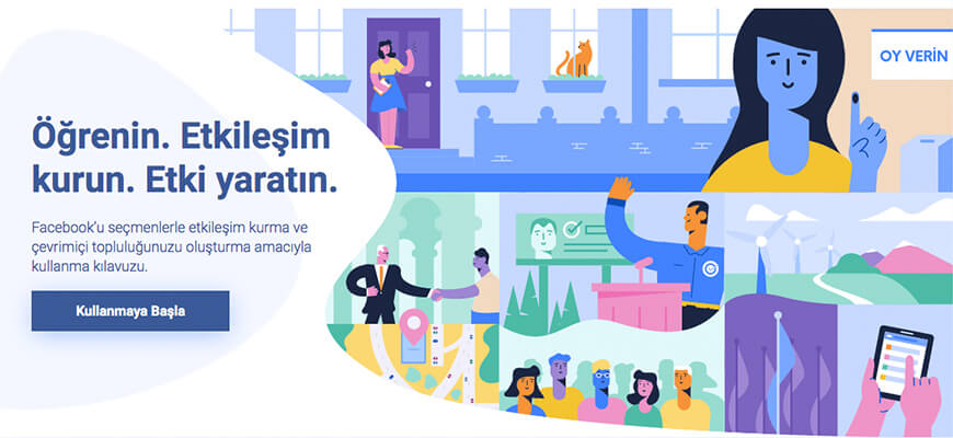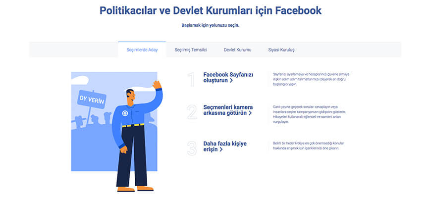 Facebook’un seçmenlerle etkileşimde bulunmak ve çevrimiçi topluluk kurmak için nasıl kullanılabileceğiyle ilgili bir rehber niteliğinde olan sayfa, Türkiye’deki politikacılar ve devlet kurumları için yardımcı bir kaynak olma amacı taşıyor.