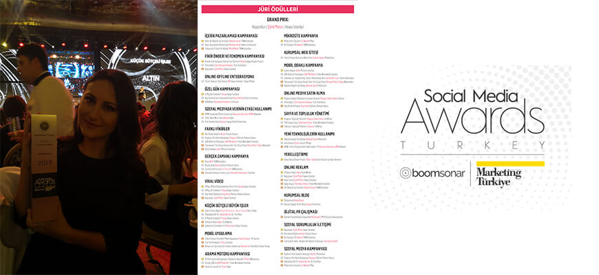 Bu sene üçüncüsü düzenlenen Social Media Awards Turkey 2019’da 1 Mart 2018- 12 Mart 2019 tarihleri arasında dijitalde yayınlanan çalışmalar katıldı. Yarışmanın ödüllendirme sistemiyse Jüri Ödülleri, BoomSonar’ın “Sosyal Medya Marka Endeksi” olan SocialBrands Veri Analitiği Ödülleri ve Grand Prix olmak üzere üç bölümden oluştu. Veri Ödülleri’nde sıralama yapılırken SocialBrands’in 30’dan fazla veri temelli kriter kullanan algoritması temel alındı. Tüm bölümlerde en başarılı işler Altın, Gümüş ve Bronz Ödüllerin sahibi oldu.