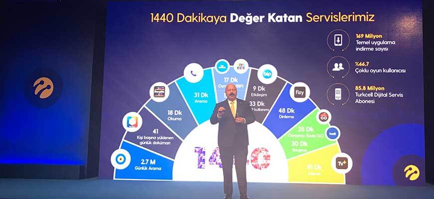 Turkcell’in dijital servislerine olan talebin ivme kazarak yükselmeye devam ettiğine dikkat çeken Kaan Terzioğlu, “2018’de genişlettiğimiz ve yeni özelliklerle zenginleştirdiğimiz dijital ürün portföyümüzle 85.8 milyon abone ve 169 milyon indirme rakamına ulaştık. 4.5G kullanıcılarının ortalama data tüketimi 7.6 GB’a yükseldi. Turkcell Türkiye’nin mobil çoklu teklif müşteri oranı yıllık 10,9 puan artışla yüzde 66,7’ye ulaşırken, sabit tarafta TV’li çoklu oyun müşterileri oranı da yüzde 48,6 oldu. Müşterilerimizin, bir gün içerisinde hayatlarına dokunduğumuz dakika sayısı 2018 yılında artışını sürdürdü. Artık müşterilerimiz fizy’den günde ortalama 48 dakika müzik dinliyor, Dergilik’te 18 dakika dergi ve gazete okuyor, TV+ uygulamamızdan 81 dakika TV ve film izliyor. Müşterilerimiz kullandıkları her türlü dijital serviste Turkcell teknolojilerinin güvenini hissetsinler diye bir gündeki 1440 dakikanın tümüne hitap edebilecek uygulamalar geliştirmeye devam edeceğiz” diye konuştu.