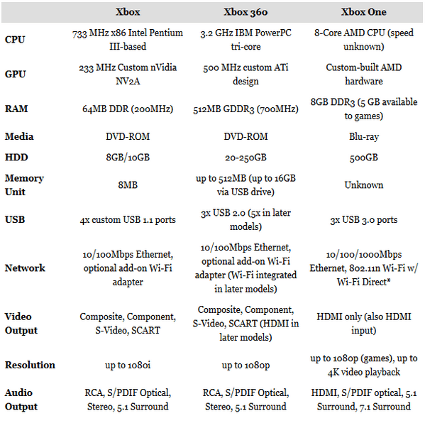 Xbox One’nın karşılaştırmalı sistem özellikleri ise aşağıda;
